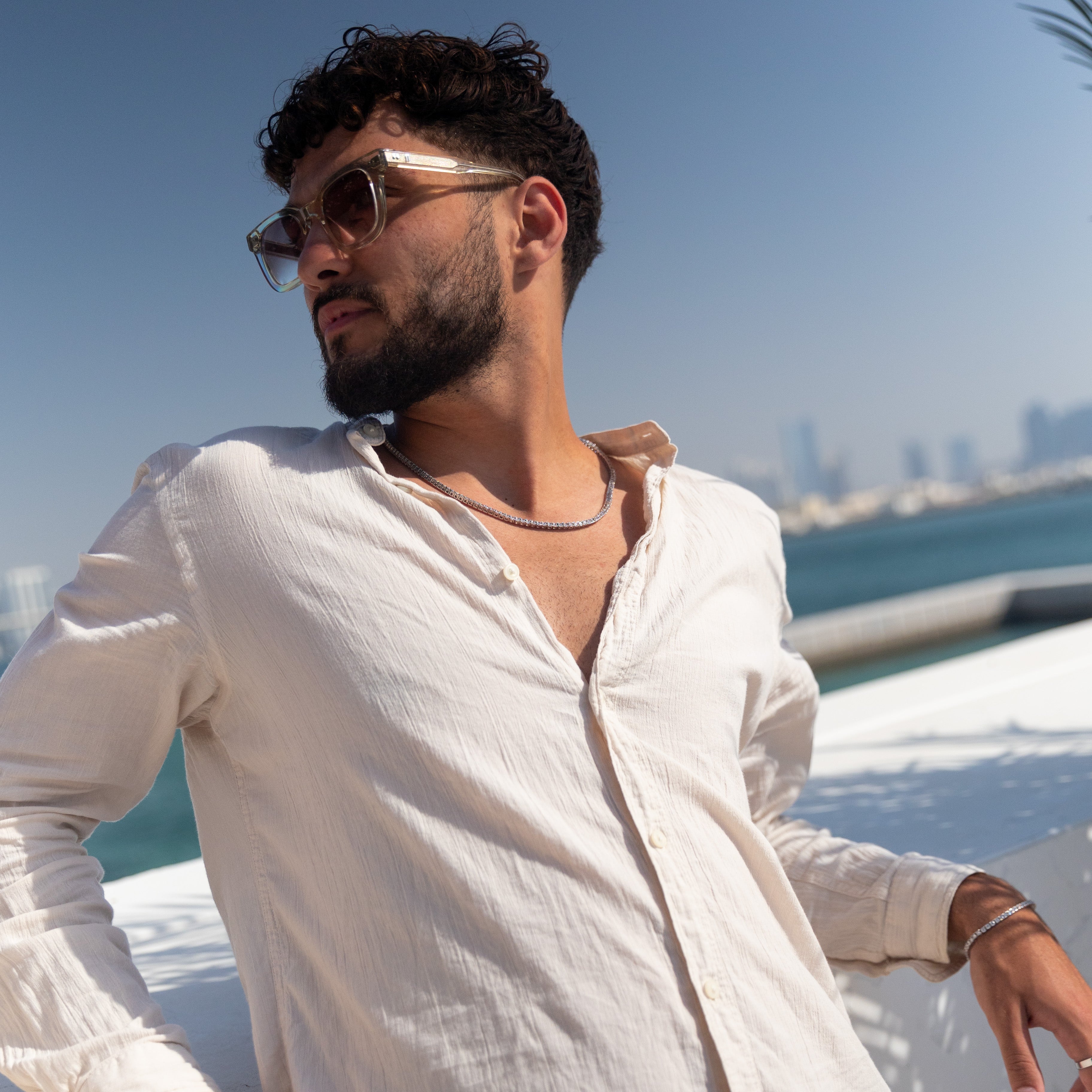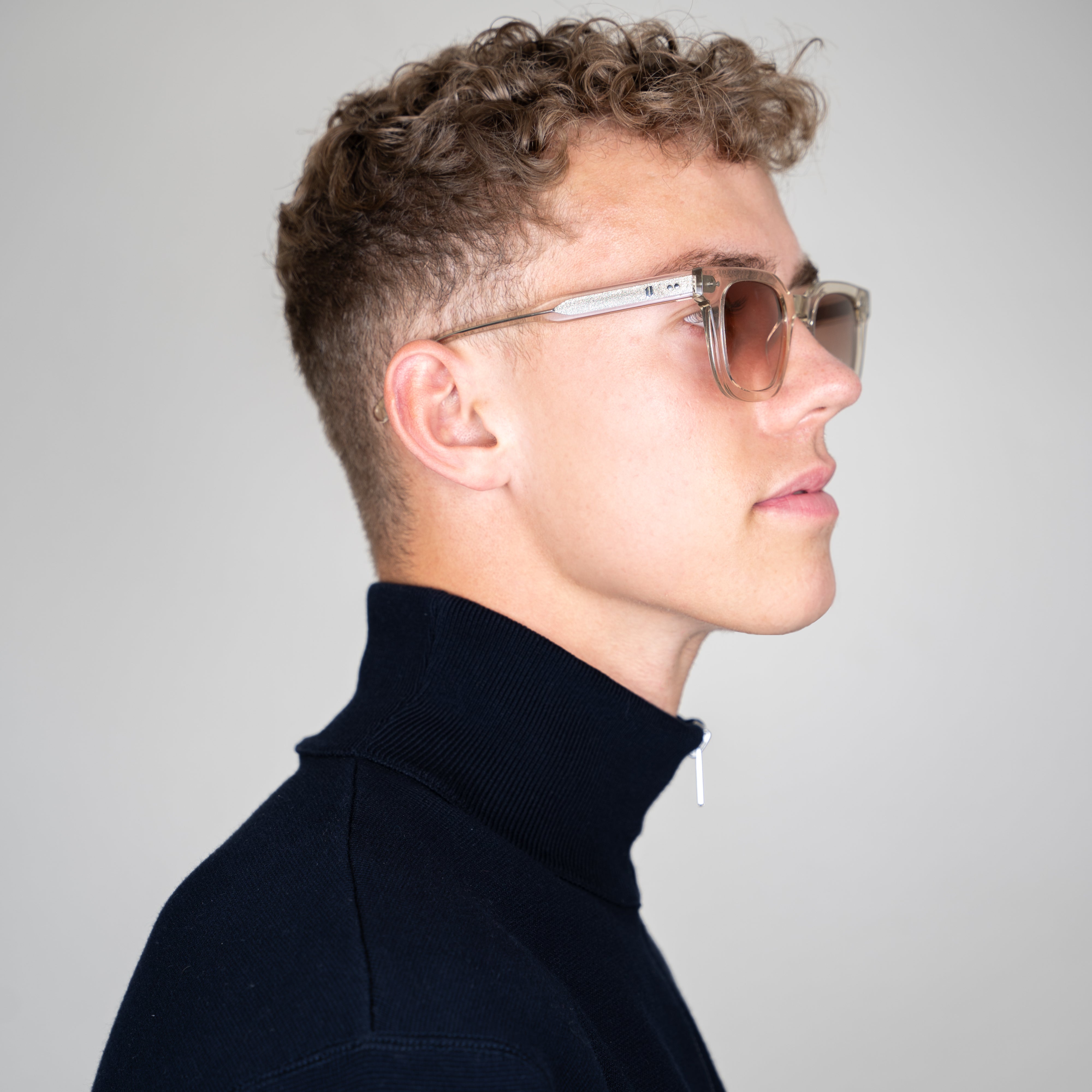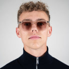 11 Create Your World - Zonnebril Ecru is een stijlvolle bril die een dynamisch contrast creëert met zijn robuuste rechthoekige montuur en slanke zijkanten. Dit luxe exemplaar is met de hand gemaakt van hoogwaardig Mazzucchelli-acetaat.