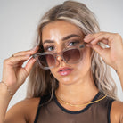 Ook is het voorzien van zilverkleurige hardwareklinknagels en puntige uiteinden van de pootjes. De diepe schuine insnijdingen langs de CR39-lenzen bieden niet alleen een unieke afwerking, maar ook bescherming tegen schadelijke UV-stralen.