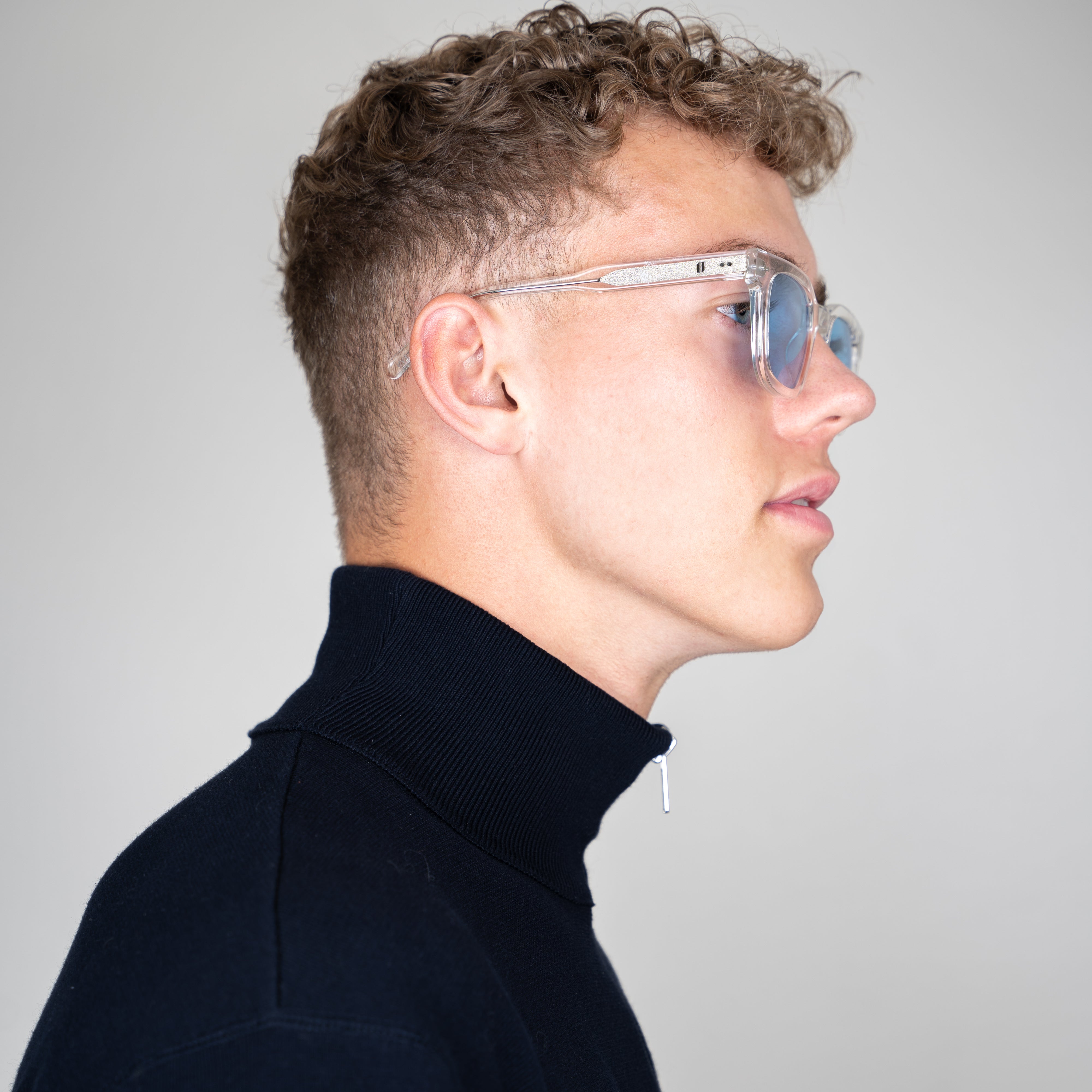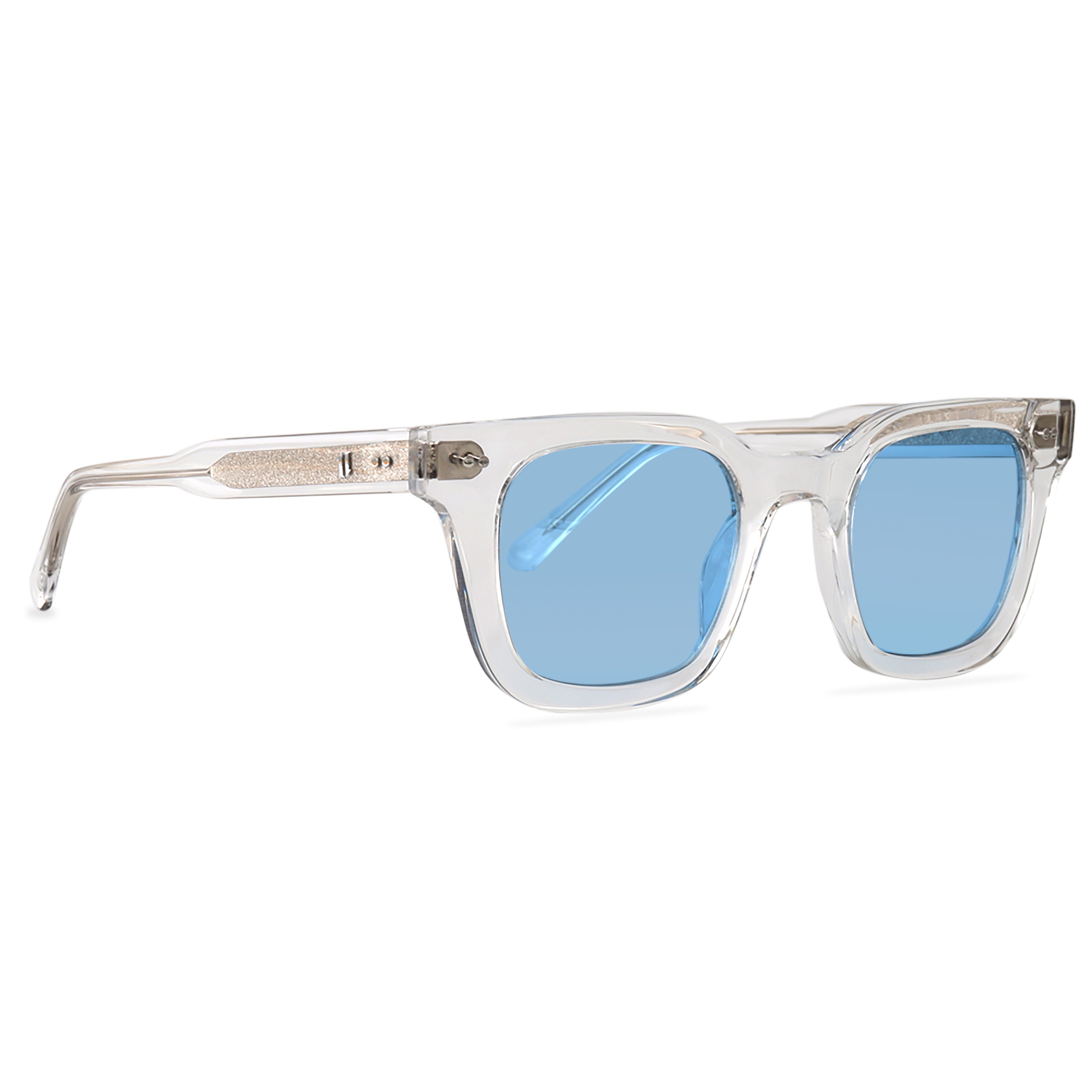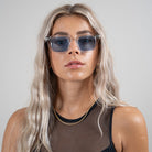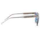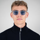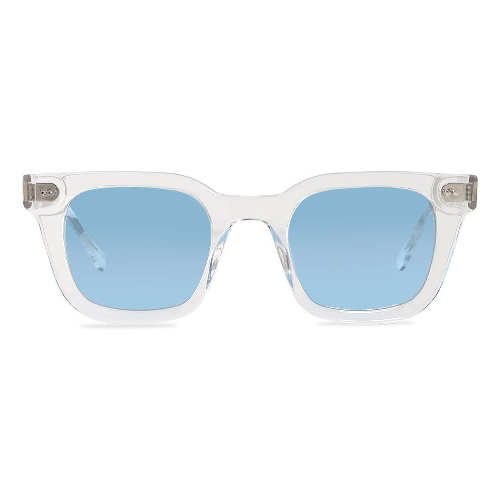 11 Create Your World - Zonnebril Helder- Blauw is een stijlvolle bril die een dynamisch contrast creëert met zijn robuuste rechthoekige montuur en slanke zijkanten. Dit luxe exemplaar is met de hand gemaakt van hoogwaardig Mazzucchelli-acetaat.