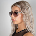 Ook is het voorzien van zilverkleurige hardwareklinknagels en puntige uiteinden van de pootjes. De diepe schuine insnijdingen langs de CR39-lenzen bieden niet alleen een unieke afwerking, maar ook bescherming tegen schadelijke UV-stralen.