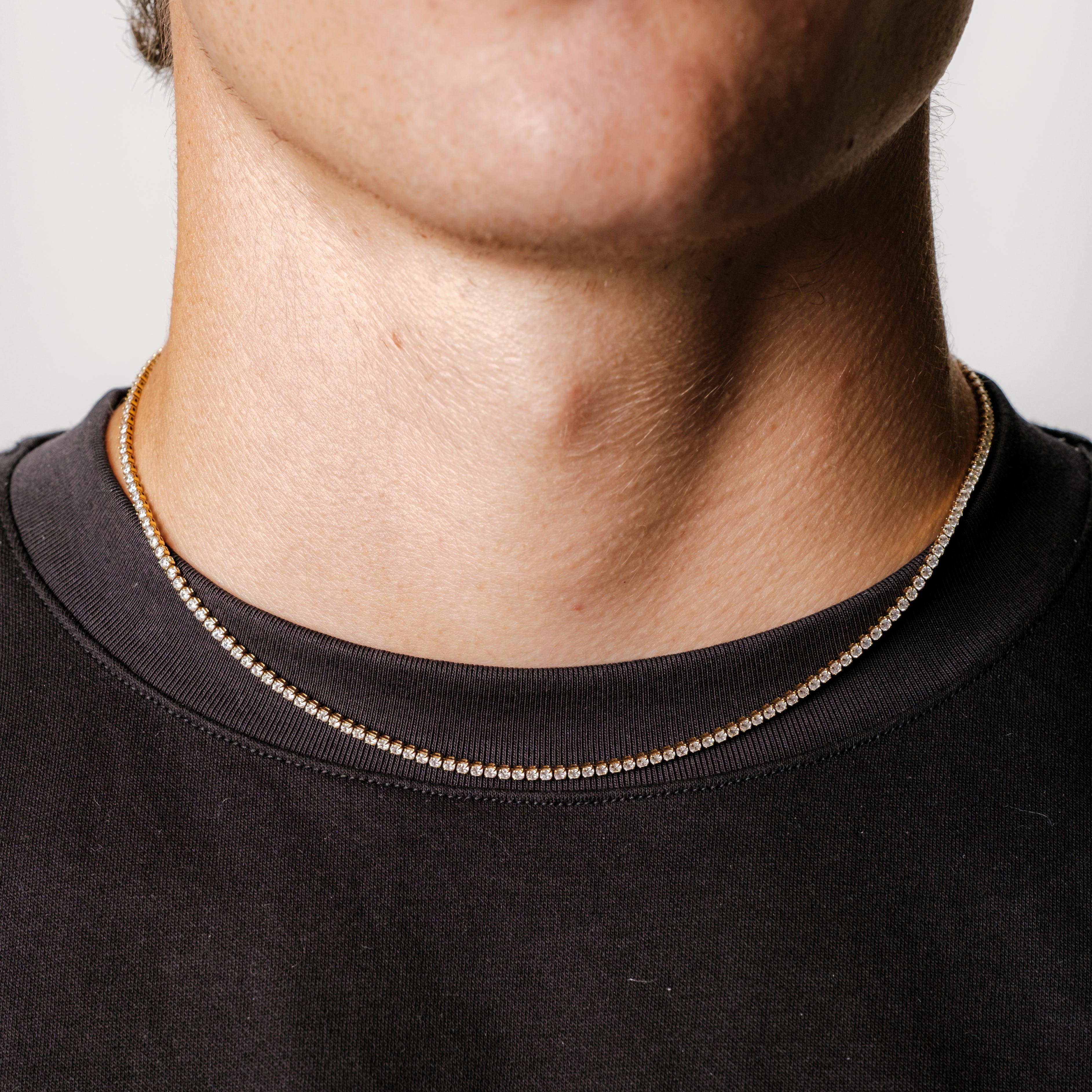 The 2mm Tennis Chain delivers a perfect balance of minimalism and elegance. Featuring a continuous row of carefully set stones, it adds just the right amount of sparkle to any look. Whether worn solo for a refined touch or layered with other chains, this piece offers effortless sophistication designed for everyday wear.